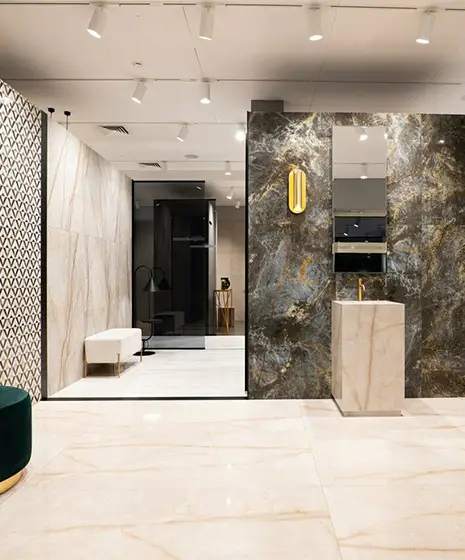 Форматы под любую задачу. От классических размеров до крупноформатных размеров 120×278 см — когда нужна монолитная поверхность с минимумом швов. Отдельная история — керамогранит толщиной 20 мм: его укладывают на улицу: террасы, эксплуатируемые кровли, парковки. Выдерживает вес автомобиля