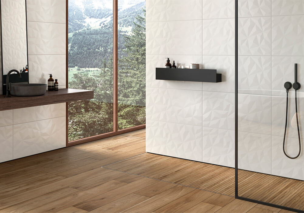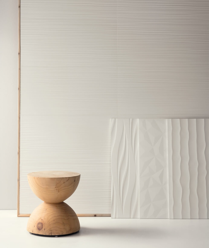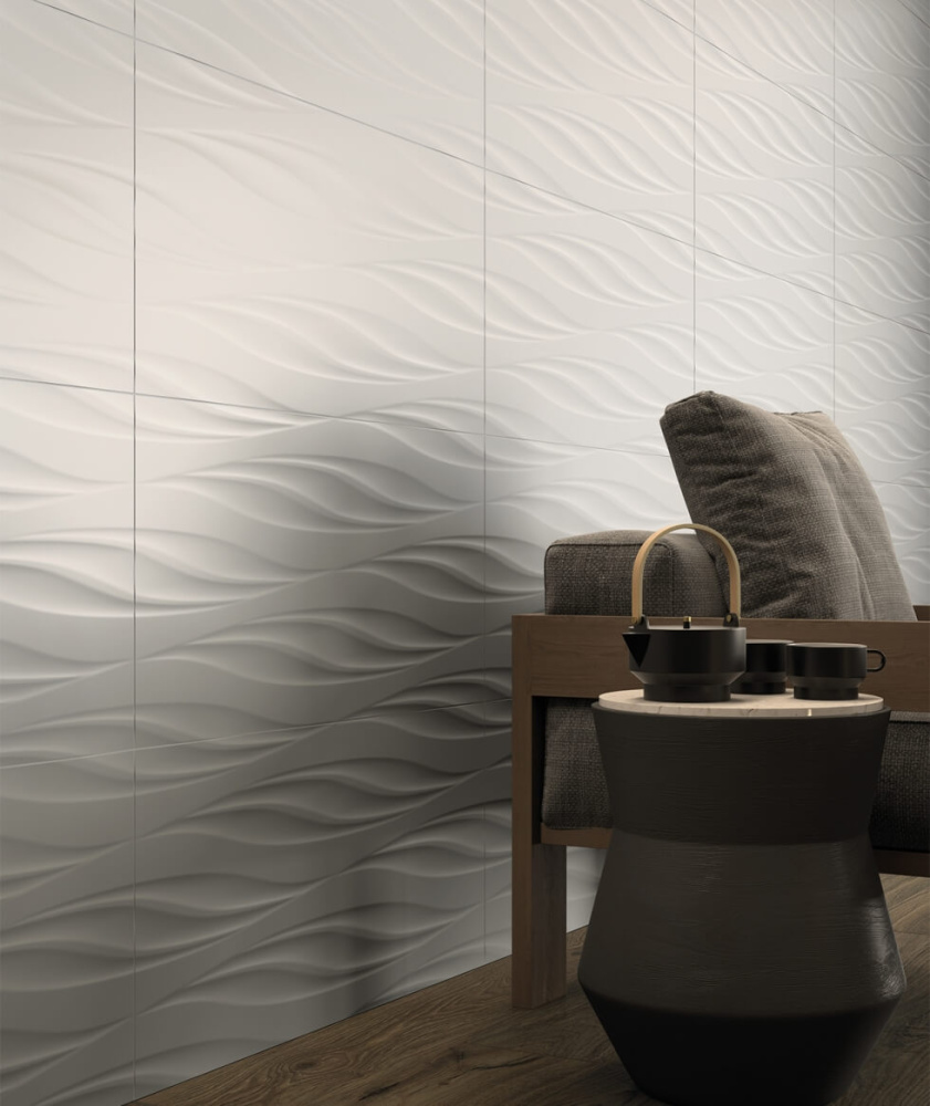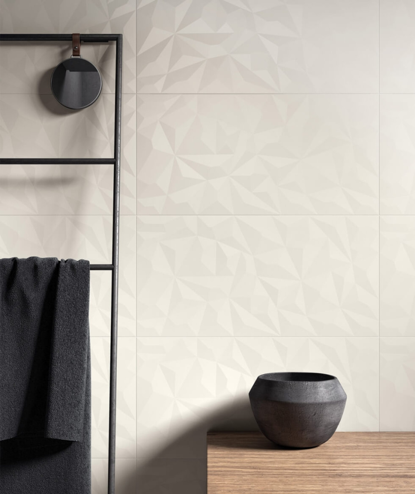 Пять структур предлагают разные сценарии для интерьера. Гладкий фон White Matt подходит для лаконичных и строгих пространств. Три структуры с динамичным извилистым дизайном — 3D Polygon, 3D Wave, 3D Bold — добавляют движения. Многогранная структура 3D Line завершает линейку. Белоснежный цвет, дополненный трехмерным геометрическим изображением, оживляет дизайн и наполняет помещение светом. Белая плитка визуально расширяет границы пространства, создавая иллюзию параллельного измерения.