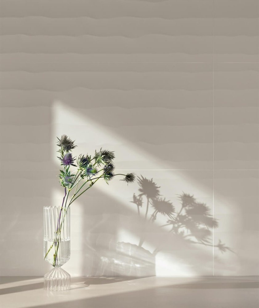 Прикосновение к поверхности этой плитки удивляет — шелковистая мягкость сочетается с объемными паттернами, которые придают стенам динамизм и движение. Настенная плитка из белой глины в формате 40x80 см создана по технологии монопорозы, а природные стихии послужили вдохновением для коллекции 3D Experience от Italon.