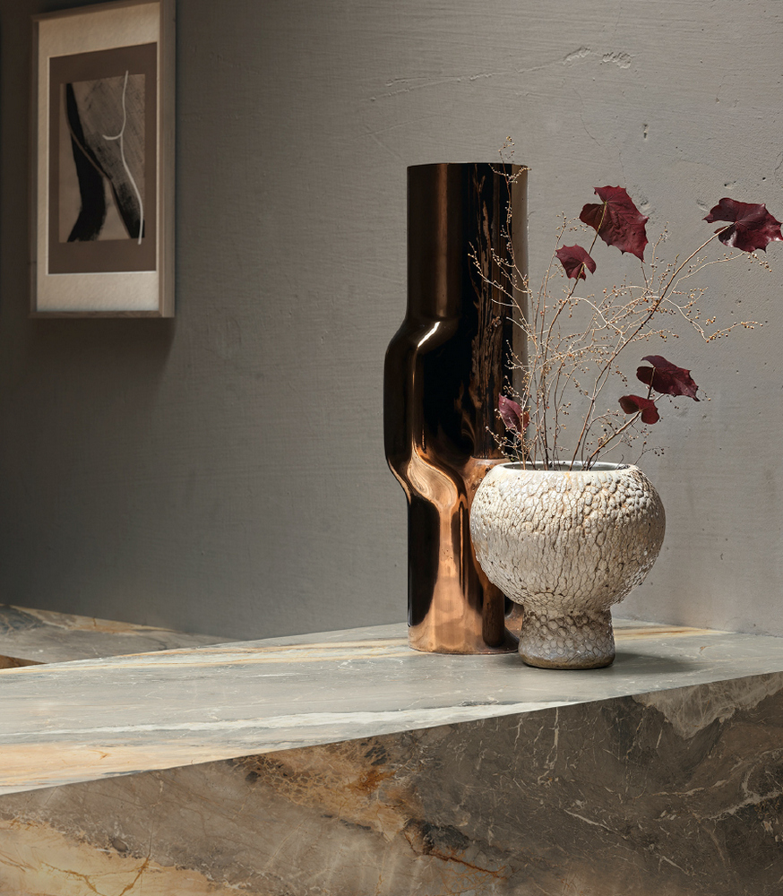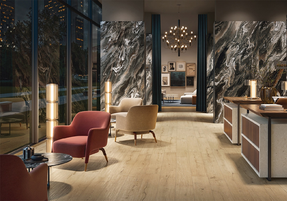 Древесная часть коллекции заслуживает отдельного внимания. Italon сознательно развёл четыре цвета по характеру — от почти нейтрального фона с едва читаемыми волокнами до фактуры с выраженной патиной и глубоким тоном. Это не вариации одного оттенка, а самостоятельные инструменты для разных интерьерных задач. Спальня, гостиная, ресторан — каждое пространство получает свой темперамент поверхности, оставаясь при этом внутри единого дизайнерского языка коллекции Аура.