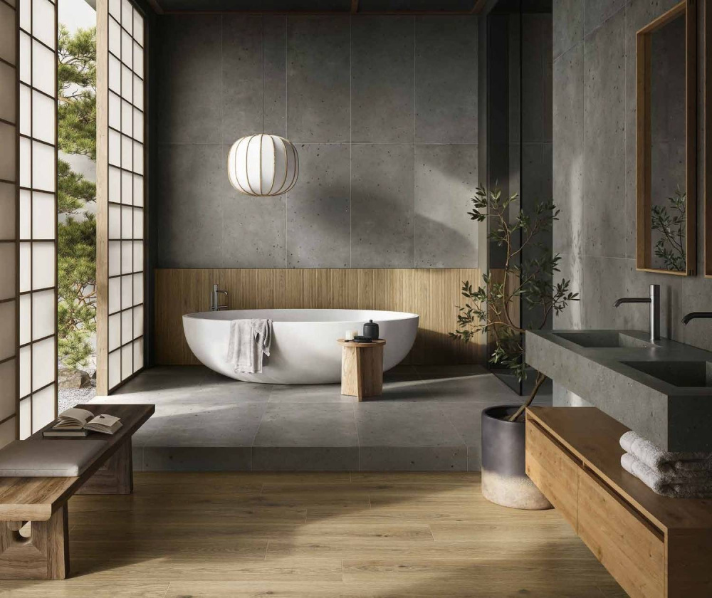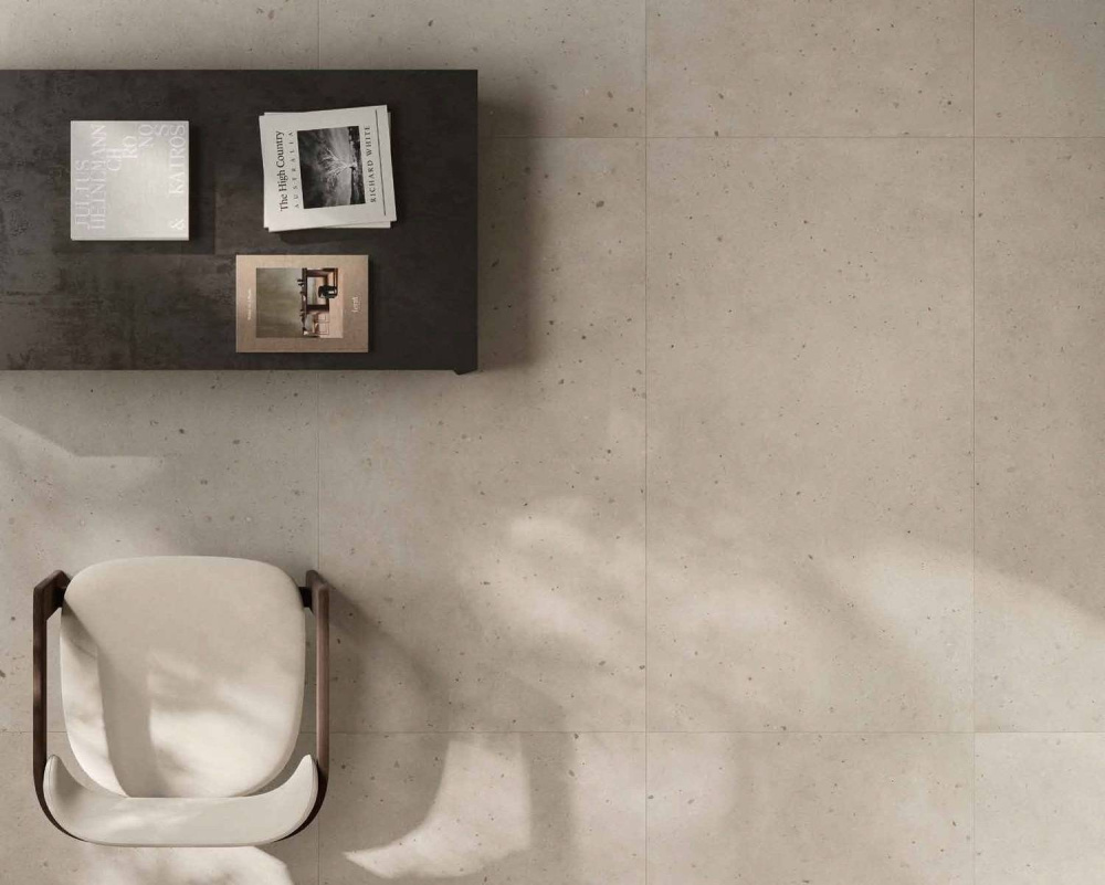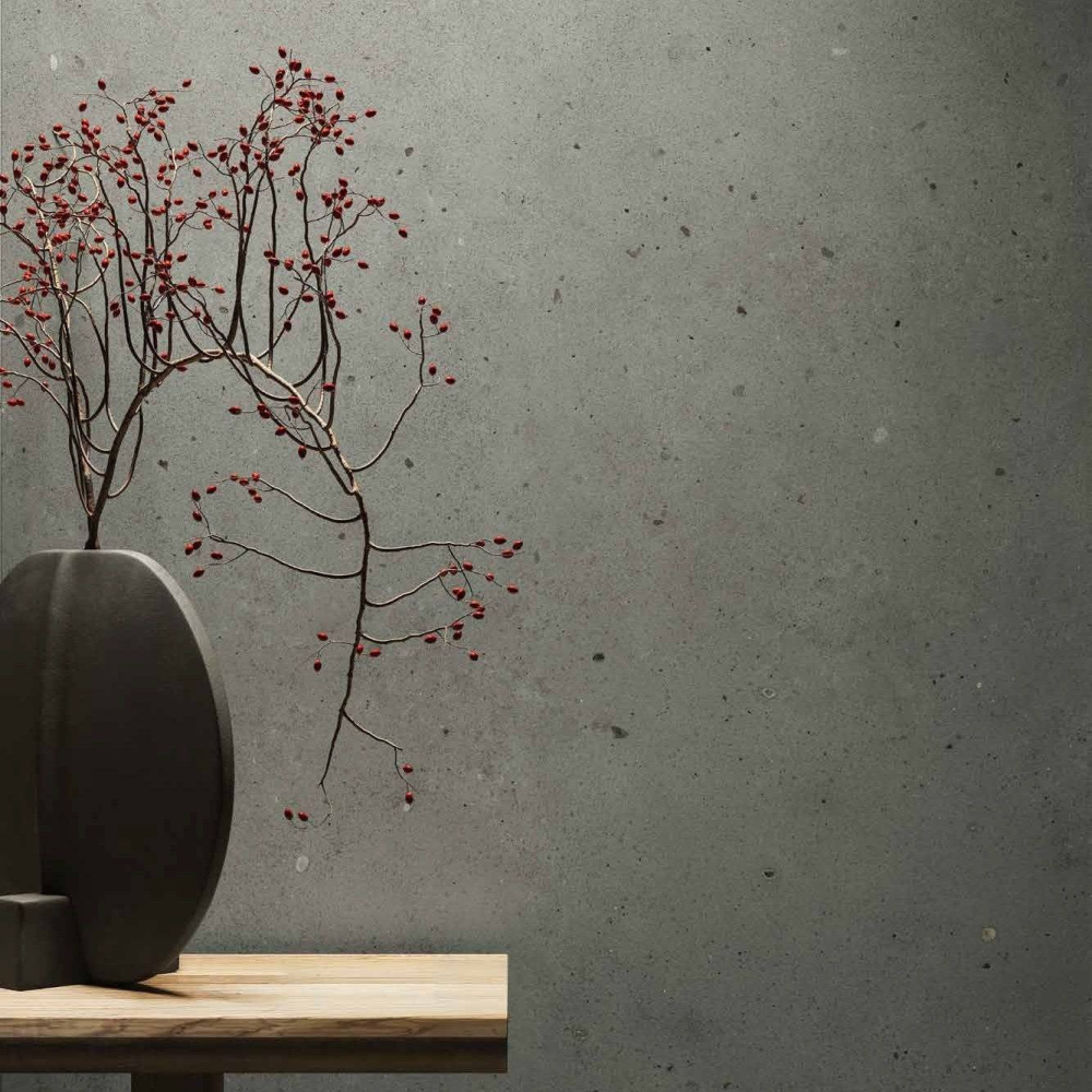 На поверхности воссоздана легкая структура оригинального материала. Пять цветов с нейтральным фоном и разноформатными вкраплениями — Пьюр, Даст, Сильвер, Айрон, Блэк — представлены в форматах 60x120, 120х120 и 80x160 см толщиной 9 мм с натуральной поверхностью. Такой керамогранит под бетон станет безупречной основой проекта, предлагая переход от светлого к темному, от теплого тона к холодному.