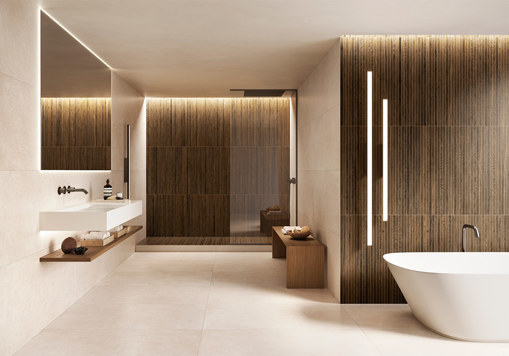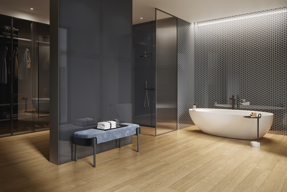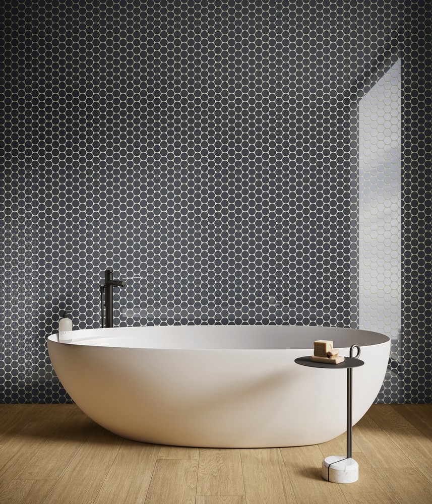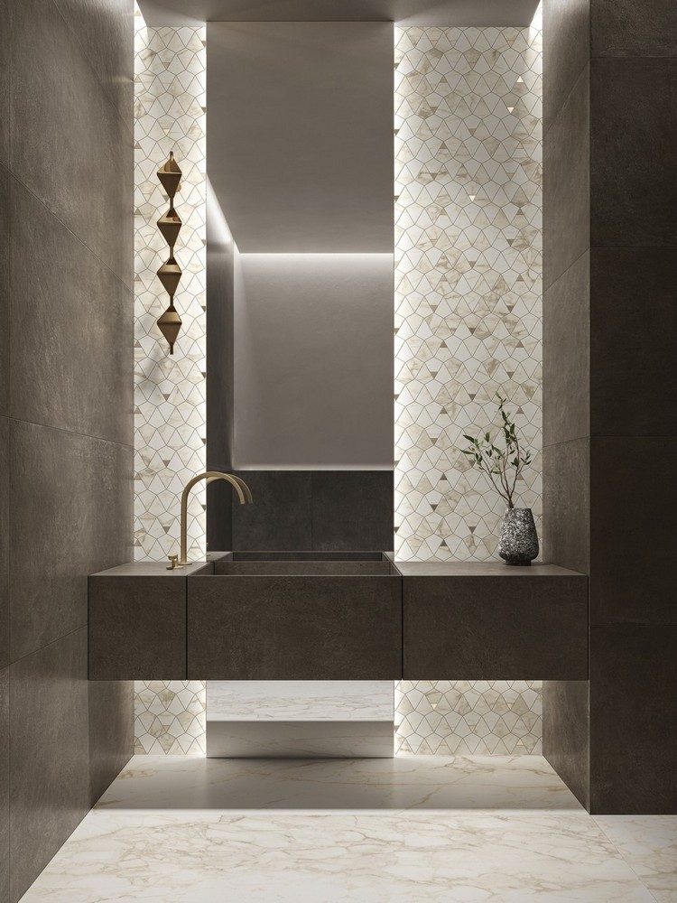 Декоративные элементы Этернум наполняют проект выразительностью и динамизмом. Мозаика Калейдо с пикселями неправильной геометрической формы доступна в цветах Сноу, Крим, Голд и Кофи. Динамичная мозаика Лаунж в оттенках Гласс Корал и Гласс Авио создает яркий визуальный эффект для акцентной стены в ванной. Мозаика Вертекс с золотыми вставками в цвете Каррара помогает создать роскошный запоминающийся дизайн. Декор Татами имитирует деревянные рейки в четырех тонах — Ачеро, Роверэ, Фумэ и Могано — добавляя интерьеру оригинальности и ритма. Классическая мозаика 30х30 см и мозаика Стрип гармонично дополнят проект.