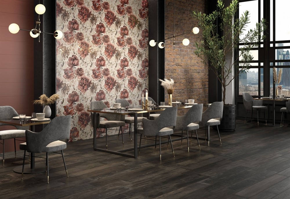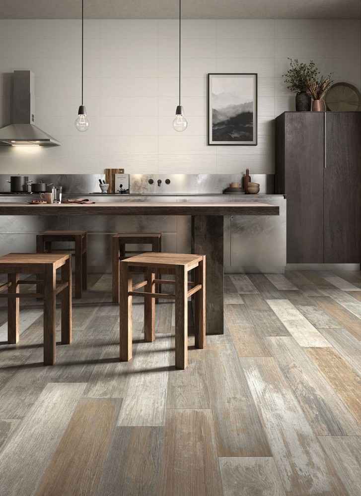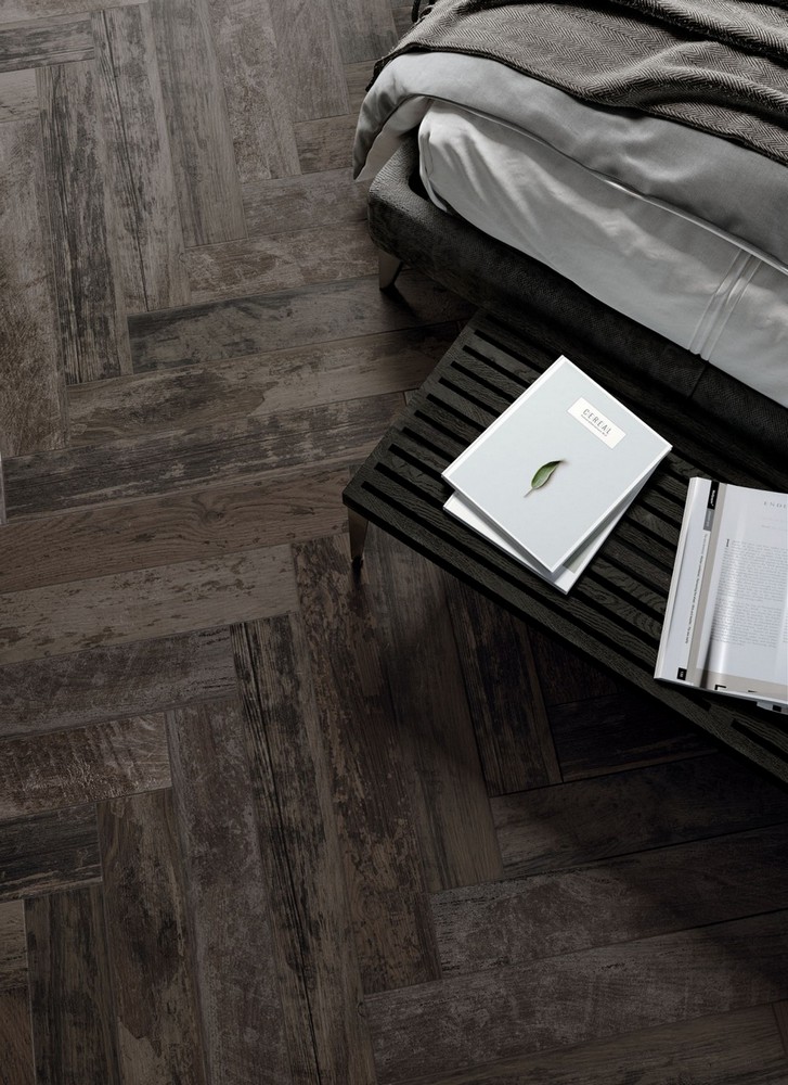 Два формата серии Грув — 20x120 см и 9,5x60 см — имитируют пропорции напольной доски. Укладка одним размером создаёт спокойный ритм, комбинация обоих превращает пол в сложную геометрическую композицию. Керамогранит не ограничен горизонтальными поверхностями: стены, облицованные состаренным деревом, завершают образ пространства.