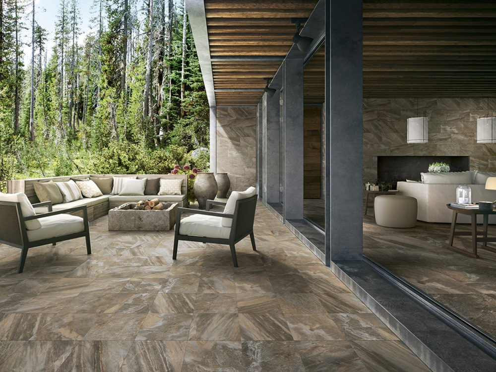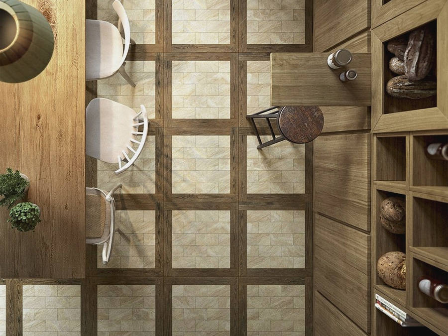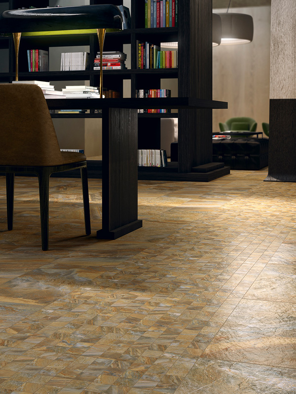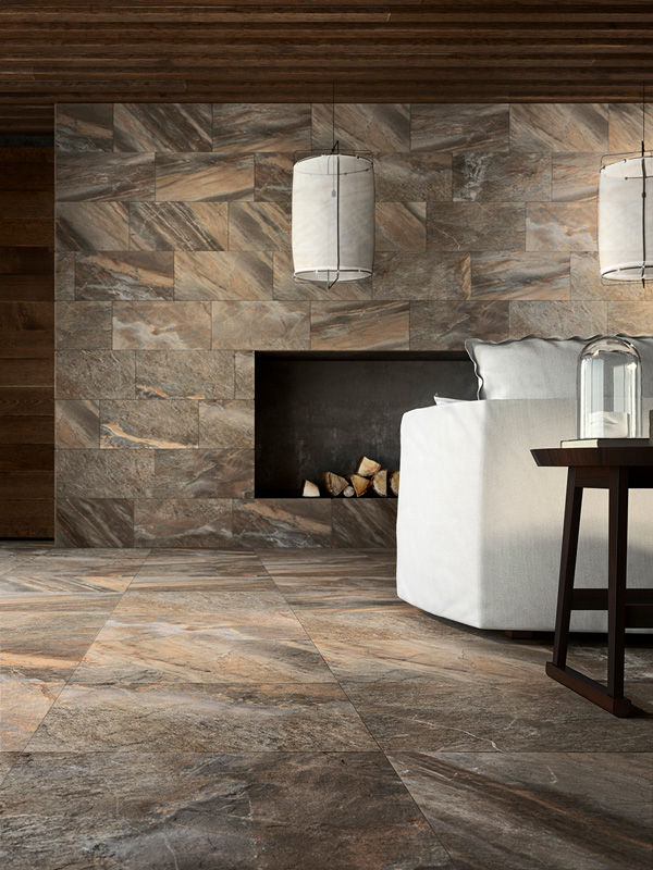 Серия Магнетик самодостаточна — такой керамогранит не требует декоративных дополнений, он сам становится главным героем интерьера. При этом материал открыт к диалогу: дерево, металл, бетон из других коллекций бренда становятся достойными партнёрами. Мозаика выдержана в каменной стилистике, вставки предлагают выбор между минеральной и древесной текстурой.