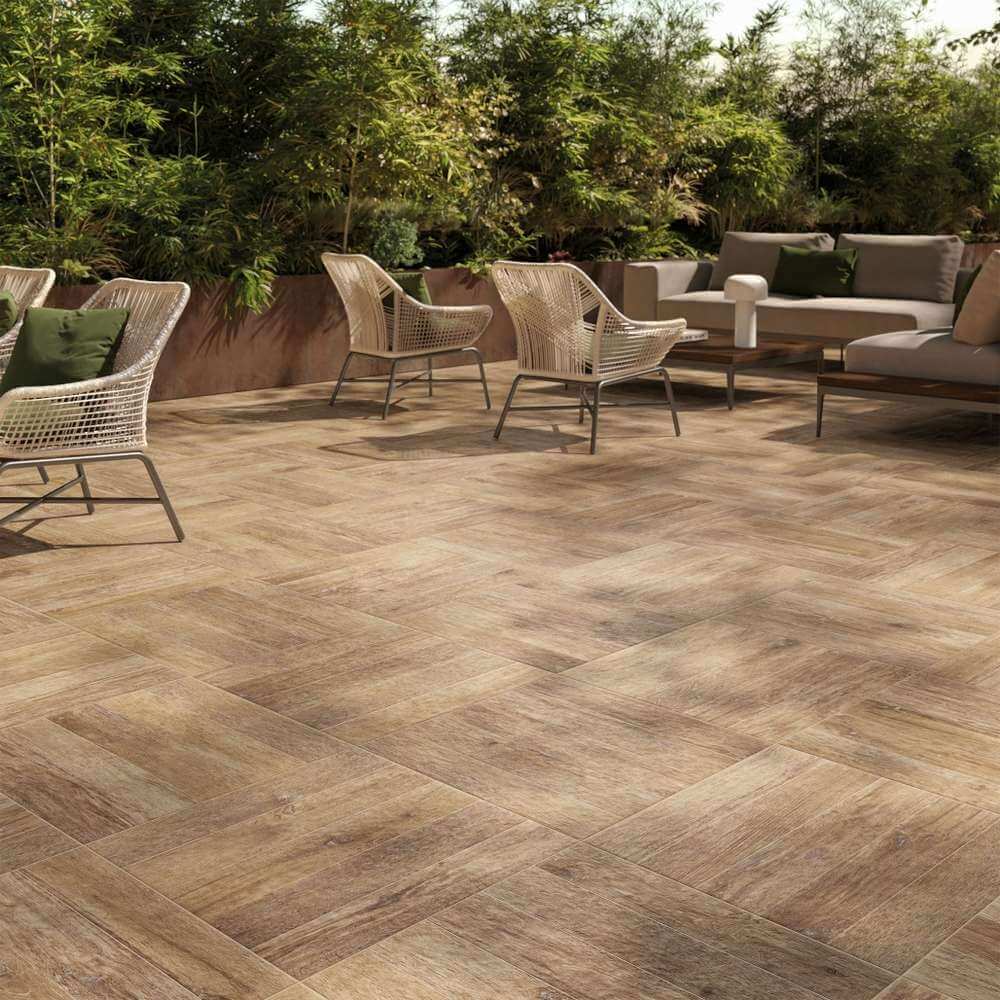 В отличие от натуральных материалов, уличный керамогранит под дерево не выгорает на солнце и не теряет своих качеств с течением времени. Противоскользящая поверхность грип идеальна для мест, где от покрытий требуются особые характеристики в эксплуатации и уходе — это важно для зон у бассейна, открытых террас и других участков, подверженных воздействию влаги.