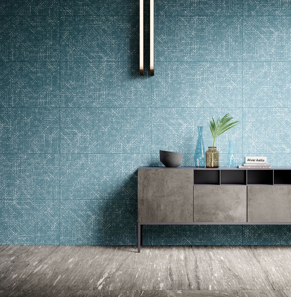 Настенная плитка из белой глины ТЕКСТУР дополняет коллекцию Скайфолл — она вдохновлена изысканными узорами жаккарда и доступна в формате 40х80 см в двух ярких оттенках: Блу и Мока.