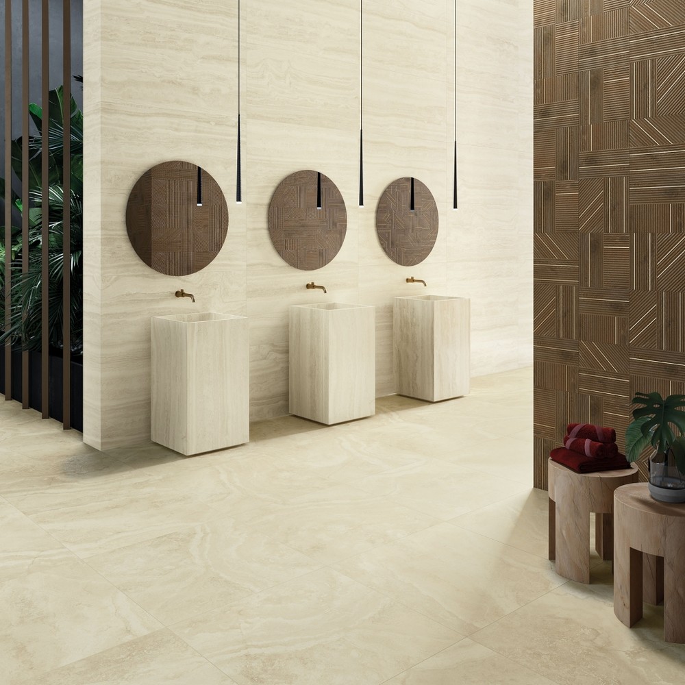 Керамогранит, имитирующий травертин из Раполано, и плитка под брашированный дуб объединены в коллекции Wonderful Life от Italon. Мягкая текстура, выразительные прожилки и уникальные цветовые переходы передают очарование природных материалов.